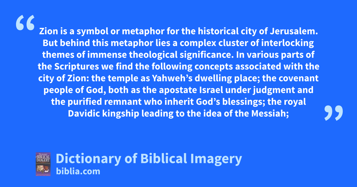 Zion is a symbol or metaphor for the historical city of Jerusalem. But behind this metaphor lies a complex cluster of interlocking themes of immense theological significance. In various parts of the Scriptures we find the following concepts associated with the city of Zion: the temple as Yahweh’s dwelling place; the covenant people of God, both as the apostate Israel under judgment and the purified remnant who inherit God’s blessings; the royal Davidic kingship leading to the idea of the Messiah;