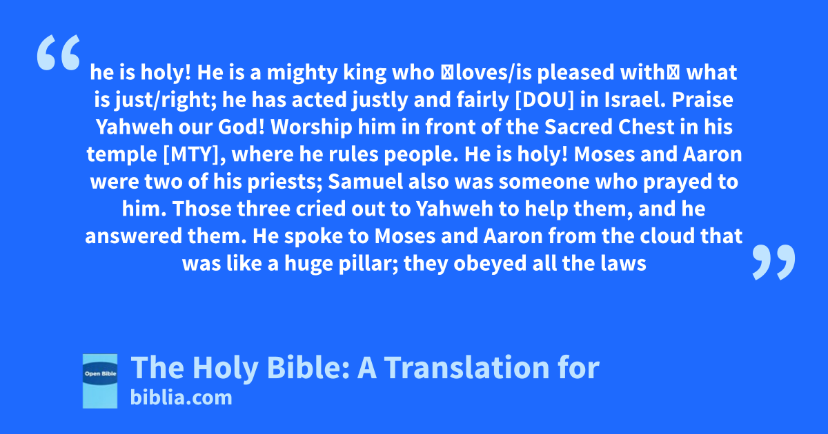 he is holy! He is a mighty king who ◄loves/is pleased with► what is just/right; he has acted justly and fairly [DOU] in Israel. Praise Yahweh our God! Worship him in front of the Sacred Chest in his temple [MTY], where he rules people. He is holy! Moses and Aaron were two of his priests; Samuel also was someone who prayed to him. Those three cried out to Yahweh to help them, and he answered them. He spoke to Moses and Aaron from the cloud that was like a huge pillar; they obeyed all the laws