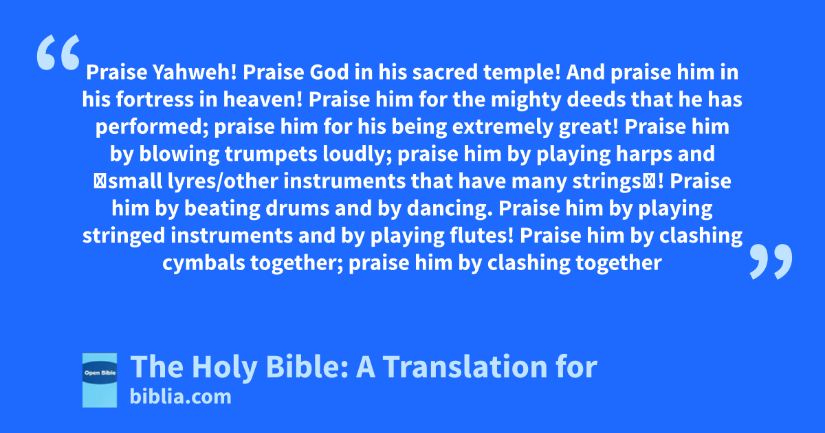 Praise Yahweh! Praise God in his sacred temple! And praise him in his fortress in heaven! Praise him for the mighty deeds that he has performed; praise him for his being extremely great! Praise him by blowing trumpets loudly; praise him by playing harps and ◄small lyres/other instruments that have many strings►! Praise him by beating drums and by dancing. Praise him by playing stringed instruments and by playing flutes! Praise him by clashing cymbals together; praise him by clashing together