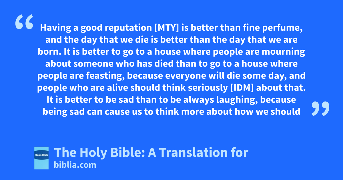 Having a good reputation [MTY] is better than fine perfume, and the day that we die is better than the day that we are born. It is better to go to a house where people are mourning about someone who has died than to go to a house where people are feasting, because everyone will die some day, and people who are alive should think seriously [IDM] about that. It is better to be sad than to be always laughing, because being sad can cause us to think more about how we should