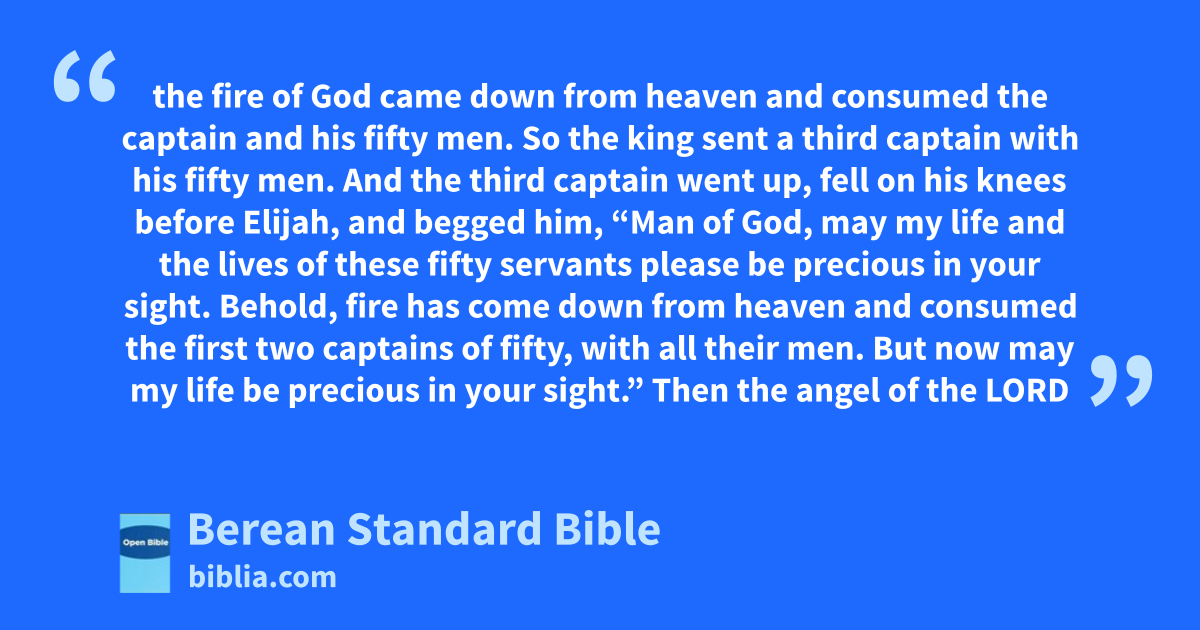 the fire of God came down from heaven and consumed the captain and his fifty men. So the king sent a third captain with his fifty men. And the third captain went up, fell on his knees before Elijah, and begged him, “Man of God, may my life and the lives of these fifty servants please be precious in your sight. Behold, fire has come down from heaven and consumed the first two captains of fifty, with all their men. But now may my life be precious in your sight.” Then the angel of the LORD