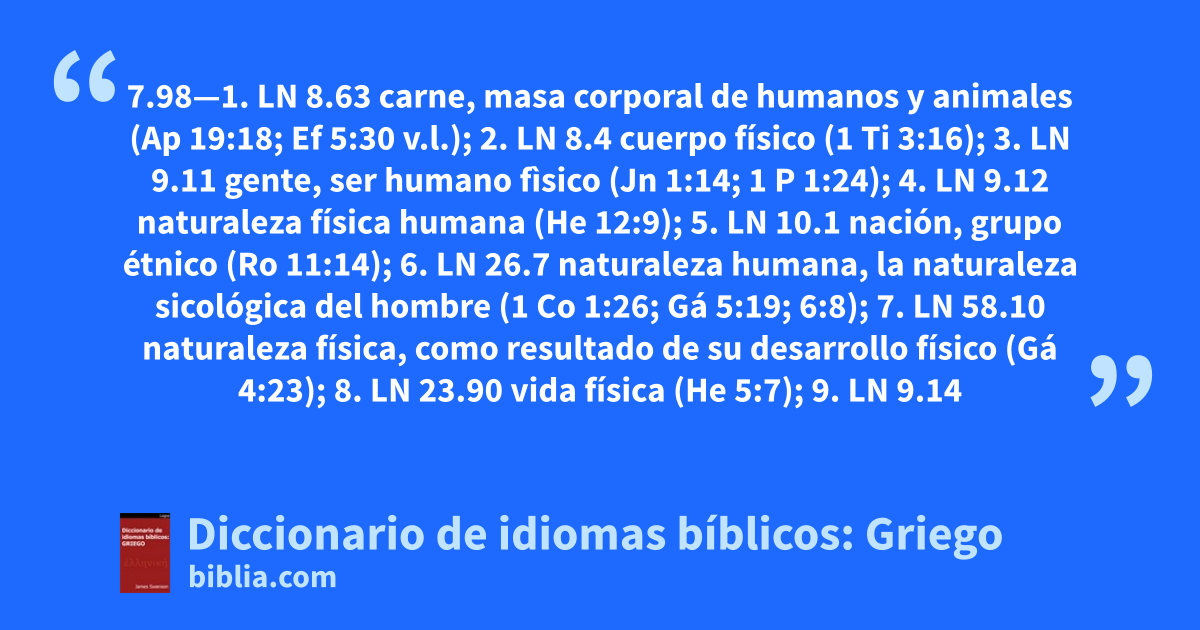 7.98—1. LN 8.63 carne, masa corporal de humanos y animales (Ap 19:18; Ef 5:30 v.l.); 2. LN 8.4 cuerpo físico (1 Ti 3:16); 3. LN 9.11 gente, ser humano fìsico (Jn 1:14; 1 P 1:24); 4. LN 9.12 naturaleza física humana (He 12:9); 5. LN 10.1 nación, grupo étnico (Ro 11:14); 6. LN 26.7 naturaleza humana, la naturaleza sicológica del hombre (1 Co 1:26; Gá 5:19; 6:8); 7. LN 58.10 naturaleza física, como resultado de su desarrollo físico (Gá 4:23); 8. LN 23.90 vida física (He 5:7); 9. LN 9.14