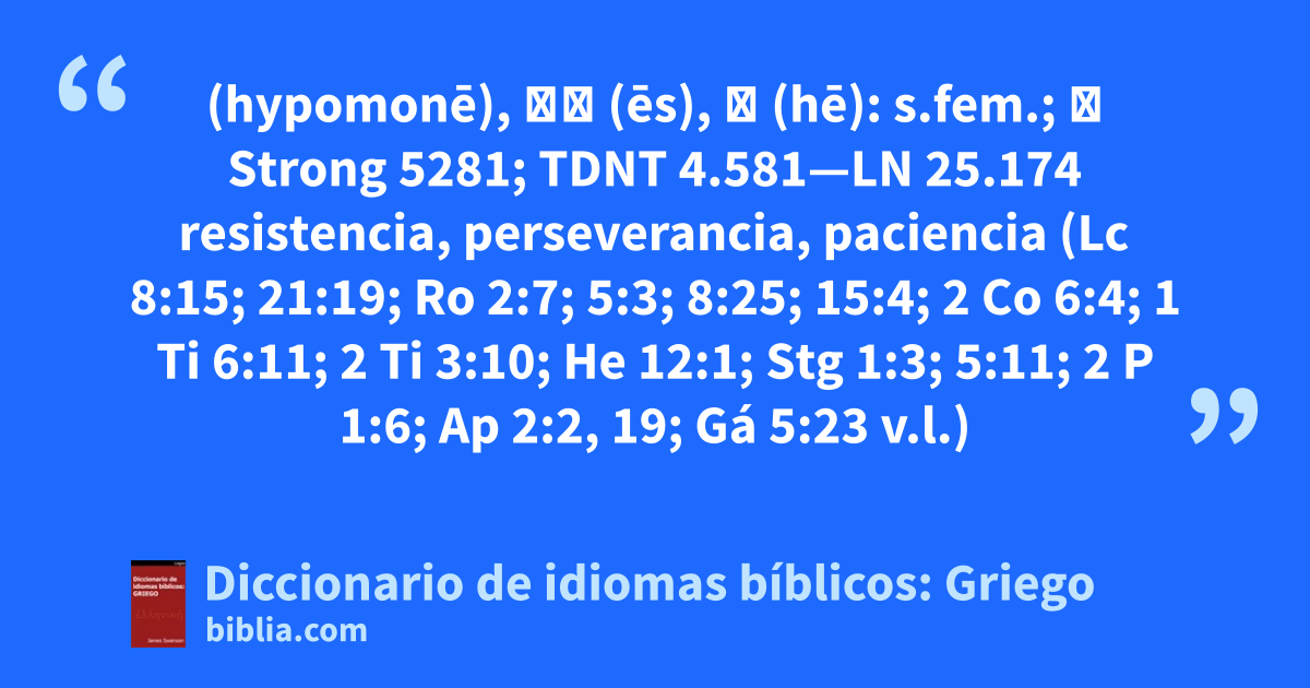 (hypomonē), ῆς (ēs), ἡ (hē): s.fem.; ≡ Strong 5281; TDNT 4.581—LN 25.174 resistencia, perseverancia, paciencia (Lc 8:15; 21:19; Ro 2:7; 5:3; 8:25; 15:4; 2 Co 6:4; 1 Ti 6:11; 2 Ti 3:10; He 12:1; Stg 1:3; 5:11; 2 P 1:6; Ap 2:2, 19; Gá 5:23 v.l.)