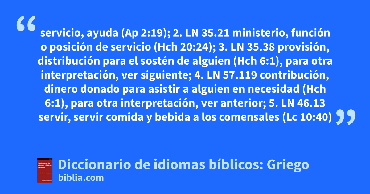 servicio, ayuda (Ap 2:19); 2. LN 35.21 ministerio, función o posición de servicio (Hch 20:24); 3. LN 35.38 provisión, distribución para el sostén de alguien (Hch 6:1), para otra interpretación, ver siguiente; 4. LN 57.119 contribución, dinero donado para asistir a alguien en necesidad (Hch 6:1), para otra interpretación, ver anterior; 5. LN 46.13 servir, servir comida y bebida a los comensales (Lc 10:40)