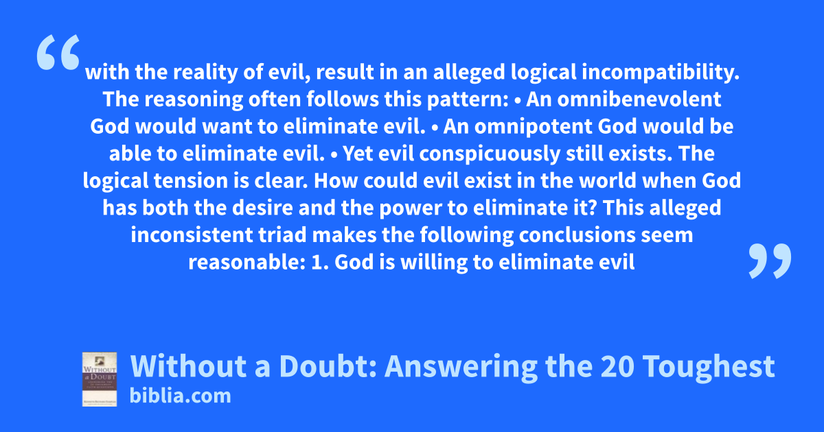with the reality of evil, result in an alleged logical incompatibility. The reasoning often follows this pattern: • An omnibenevolent God would want to eliminate evil. • An omnipotent God would be able to eliminate evil. • Yet evil conspicuously still exists. The logical tension is clear. How could evil exist in the world when God has both the desire and the power to eliminate it? This alleged inconsistent triad makes the following conclusions seem reasonable: 1. God is willing to eliminate evil