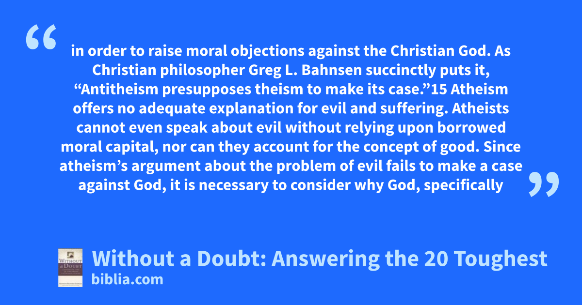in order to raise moral objections against the Christian God. As Christian philosopher Greg L. Bahnsen succinctly puts it, “Antitheism presupposes theism to make its case.”15 Atheism offers no adequate explanation for evil and suffering. Atheists cannot even speak about evil without relying upon borrowed moral capital, nor can they account for the concept of good. Since atheism’s argument about the problem of evil fails to make a case against God, it is necessary to consider why God, specifically
