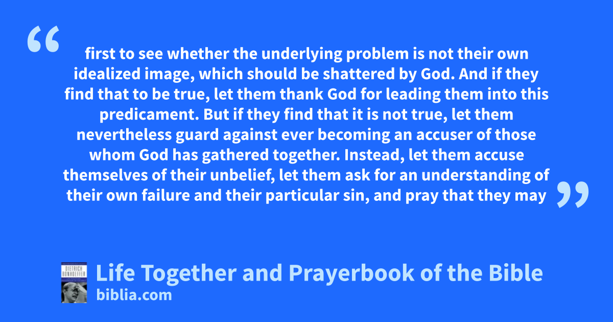 first to see whether the underlying problem is not their own idealized image, which should be shattered by God. And if they find that to be true, let them thank God for leading them into this predicament. But if they find that it is not true, let them nevertheless guard against ever becoming an accuser of those whom God has gathered together. Instead, let them accuse themselves of their unbelief, let them ask for an understanding of their own failure and their particular sin, and pray that they may