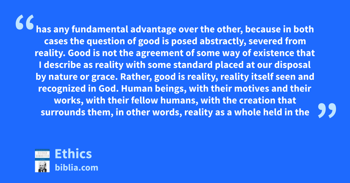 has any fundamental advantage over the other, because in both cases the question of good is posed abstractly, severed from reality. Good is not the agreement of some way of existence that I describe as reality with some standard placed at our disposal by nature or grace. Rather, good is reality, reality itself seen and recognized in God. Human beings, with their motives and their works, with their fellow humans, with the creation that surrounds them, in other words, reality as a whole held in the