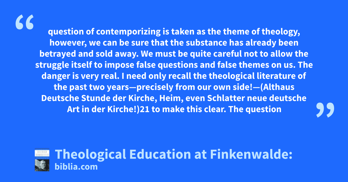 question of contemporizing is taken as the theme of theology, however, we can be sure that the substance has already been betrayed and sold away. We must be quite careful not to allow the struggle itself to impose false questions and false themes on us. The danger is very real. I need only recall the theological literature of the past two years—precisely from our own side!—(Althaus Deutsche Stunde der Kirche, Heim, even Schlatter neue deutsche Art in der Kirche!)21 to make this clear. The question