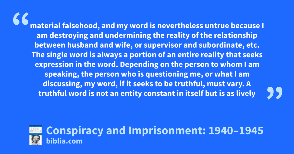 material falsehood, and my word is nevertheless untrue because I am destroying and undermining the reality of the relationship between husband and wife, or supervisor and subordinate, etc. The single word is always a portion of an entire reality that seeks expression in the word. Depending on the person to whom I am speaking, the person who is questioning me, or what I am discussing, my word, if it seeks to be truthful, must vary. A truthful word is not an entity constant in itself but is as lively