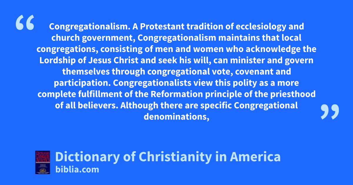Congregationalism. A Protestant tradition of ecclesiology and church government, Congregationalism maintains that local congregations, consisting of men and women who acknowledge the Lordship of Jesus Christ and seek his will, can minister and govern themselves through congregational vote, covenant and participation. Congregationalists view this polity as a more complete fulfillment of the Reformation principle of the priesthood of all believers. Although there are specific Congregational denominations,