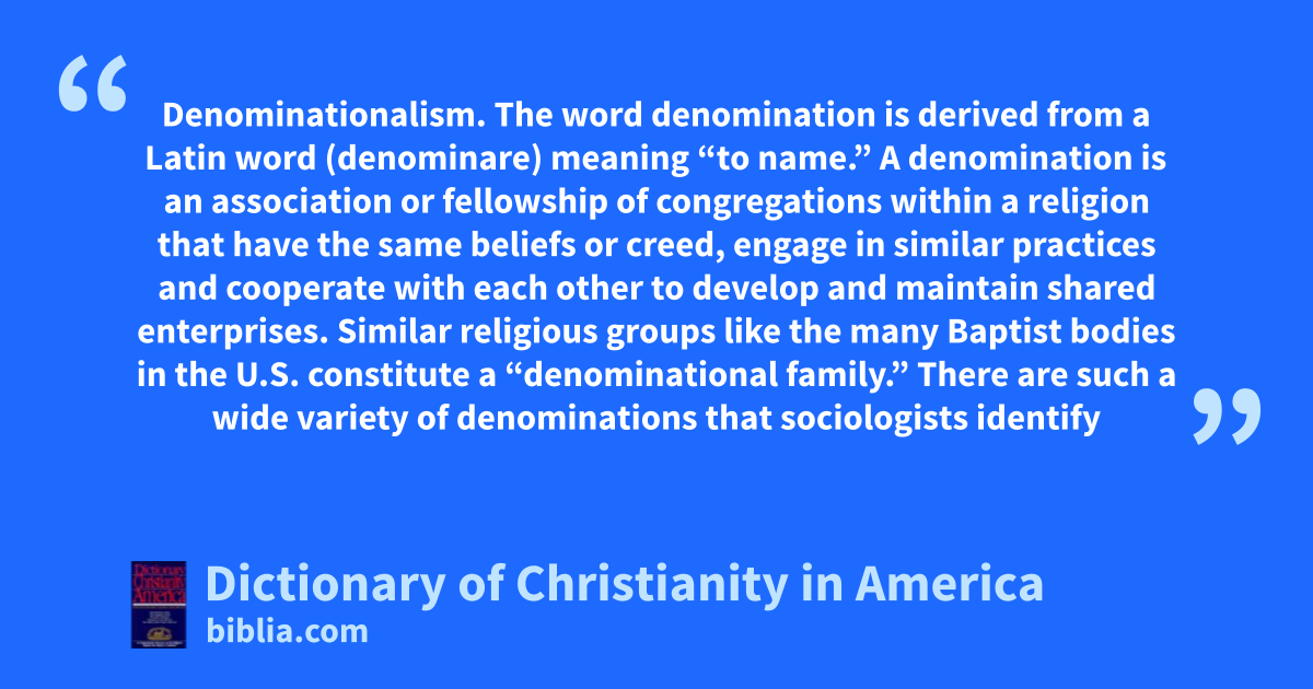 Denominationalism. The word denomination is derived from a Latin word (denominare) meaning “to name.” A denomination is an association or fellowship of congregations within a religion that have the same beliefs or creed, engage in similar practices and cooperate with each other to develop and maintain shared enterprises. Similar religious groups like the many Baptist bodies in the U.S. constitute a “denominational family.” There are such a wide variety of denominations that sociologists identify
