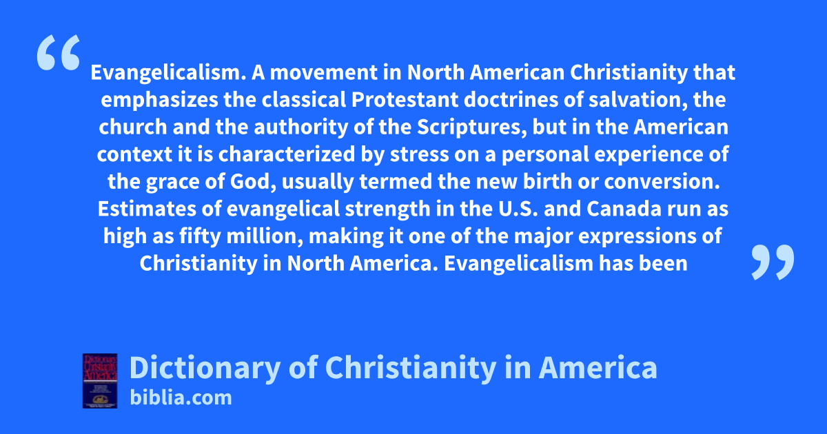 Evangelicalism. A movement in North American Christianity that emphasizes the classical Protestant doctrines of salvation, the church and the authority of the Scriptures, but in the American context it is characterized by stress on a personal experience of the grace of God, usually termed the new birth or conversion. Estimates of evangelical strength in the U.S. and Canada run as high as fifty million, making it one of the major expressions of Christianity in North America. Evangelicalism has been