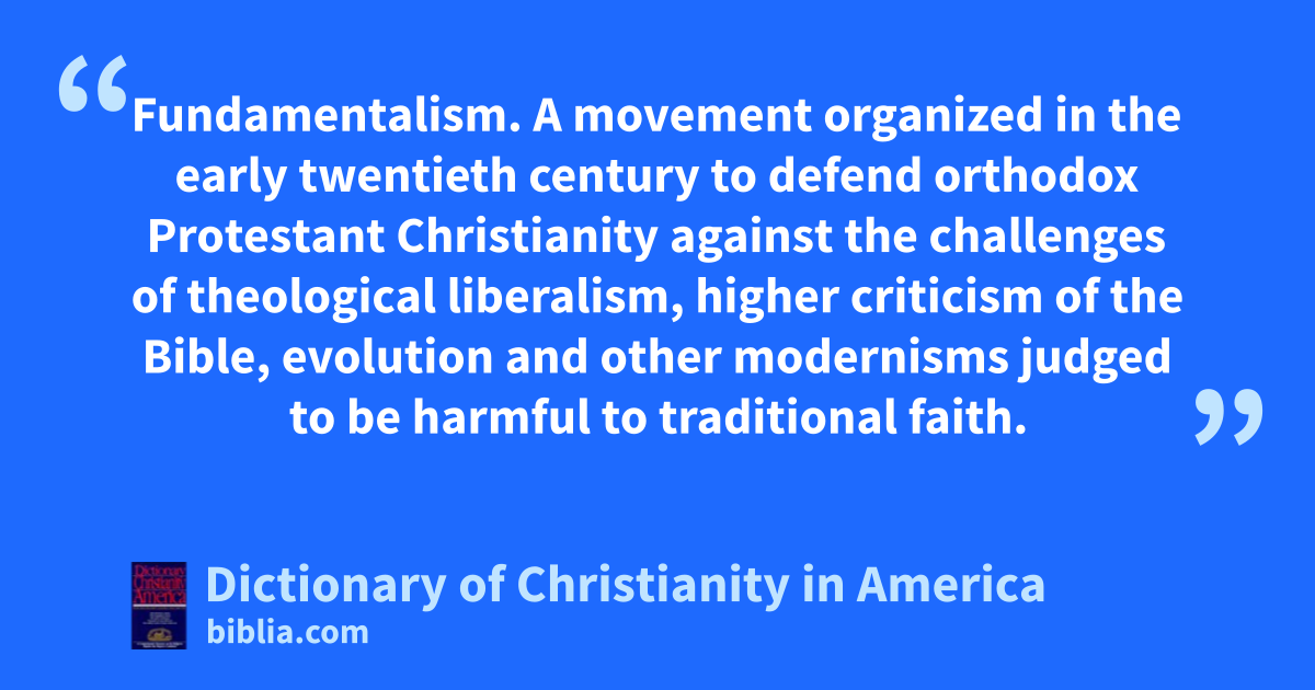 Fundamentalism. A movement organized in the early twentieth century to defend orthodox Protestant Christianity against the challenges of theological liberalism, higher criticism of the Bible, evolution and other modernisms judged to be harmful to traditional faith.