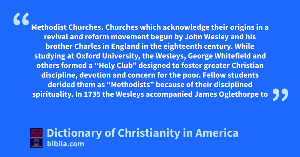 Methodist Churches. Churches which acknowledge their origins in a revival and reform movement begun by John Wesley and his brother Charles in England in the eighteenth century. While studying at Oxford University, the Wesleys, George Whitefield and others formed a “Holy Club” designed to foster greater Christian discipline, devotion and concern for the poor. Fellow students derided them as “Methodists” because of their disciplined spirituality. In 1735 the Wesleys accompanied James Oglethorpe to