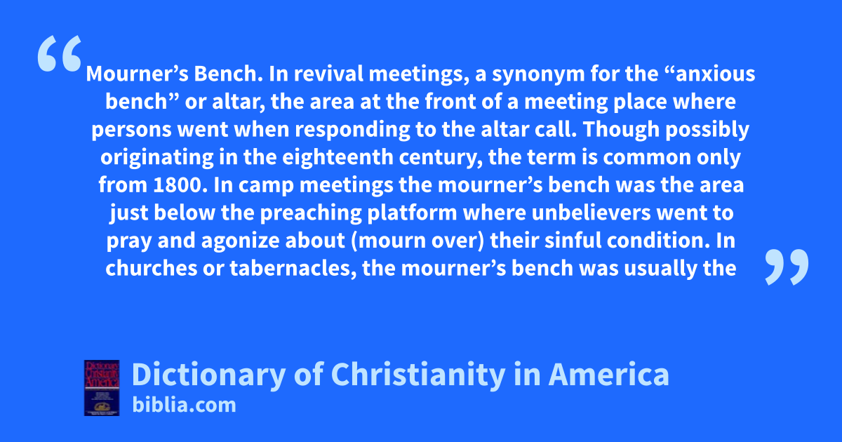 Mourner’s Bench. In revival meetings, a synonym for the “anxious bench” or altar, the area at the front of a meeting place where persons went when responding to the altar call. Though possibly originating in the eighteenth century, the term is common only from 1800. In camp meetings the mourner’s bench was the area just below the preaching platform where unbelievers went to pray and agonize about (mourn over) their sinful condition. In churches or tabernacles, the mourner’s bench was usually the