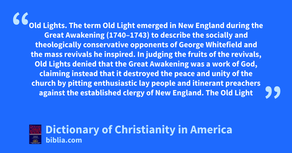 Old Lights. The term Old Light emerged in New England during the Great Awakening (1740–1743) to describe the socially and theologically conservative opponents of George Whitefield and the mass revivals he inspired. In judging the fruits of the revivals, Old Lights denied that the Great Awakening was a work of God, claiming instead that it destroyed the peace and unity of the church by pitting enthusiastic lay people and itinerant preachers against the established clergy of New England. The Old Light