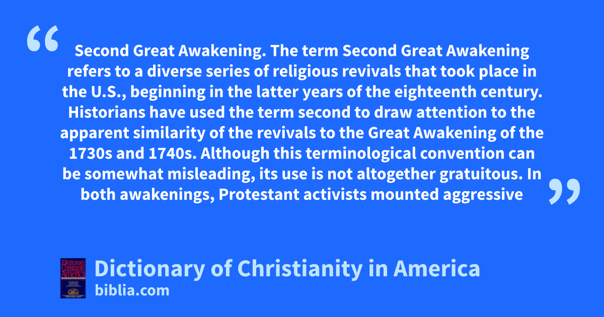 Second Great Awakening. The term Second Great Awakening refers to a diverse series of religious revivals that took place in the U.S., beginning in the latter years of the eighteenth century. Historians have used the term second to draw attention to the apparent similarity of the revivals to the Great Awakening of the 1730s and 1740s. Although this terminological convention can be somewhat misleading, its use is not altogether gratuitous. In both awakenings, Protestant activists mounted aggressive