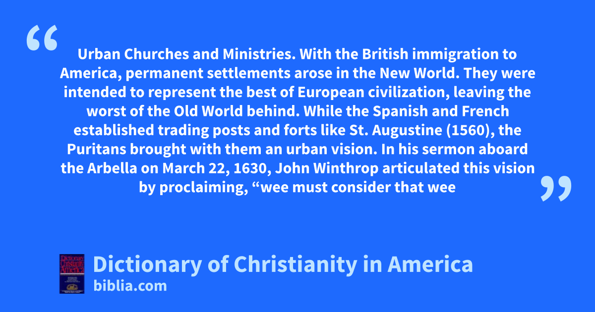 Urban Churches and Ministries. With the British immigration to America, permanent settlements arose in the New World. They were intended to represent the best of European civilization, leaving the worst of the Old World behind. While the Spanish and French established trading posts and forts like St. Augustine (1560), the Puritans brought with them an urban vision. In his sermon aboard the Arbella on March 22, 1630, John Winthrop articulated this vision by proclaiming, “wee must consider that wee