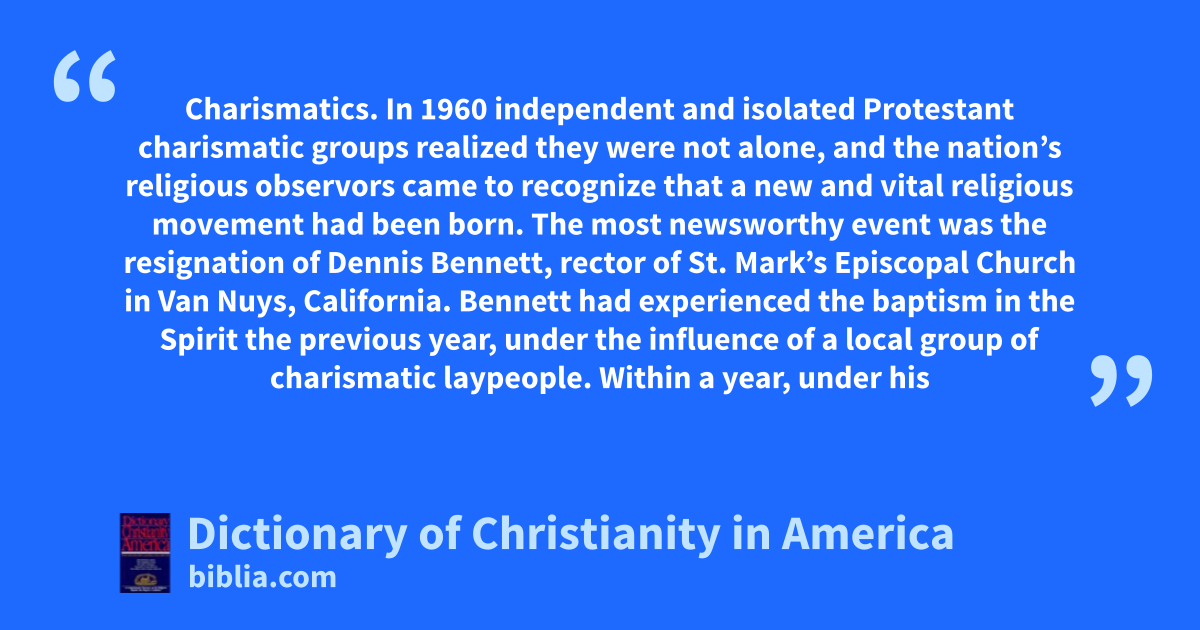 Charismatics. In 1960 independent and isolated Protestant charismatic groups realized they were not alone, and the nation’s religious observors came to recognize that a new and vital religious movement had been born. The most newsworthy event was the resignation of Dennis Bennett, rector of St. Mark’s Episcopal Church in Van Nuys, California. Bennett had experienced the baptism in the Spirit the previous year, under the influence of a local group of charismatic laypeople. Within a year, under his