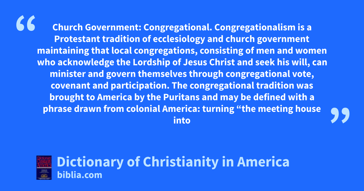 Church Government: Congregational. Congregationalism is a Protestant tradition of ecclesiology and church government maintaining that local congregations, consisting of men and women who acknowledge the Lordship of Jesus Christ and seek his will, can minister and govern themselves through congregational vote, covenant and participation. The congregational tradition was brought to America by the Puritans and may be defined with a phrase drawn from colonial America: turning “the meeting house into