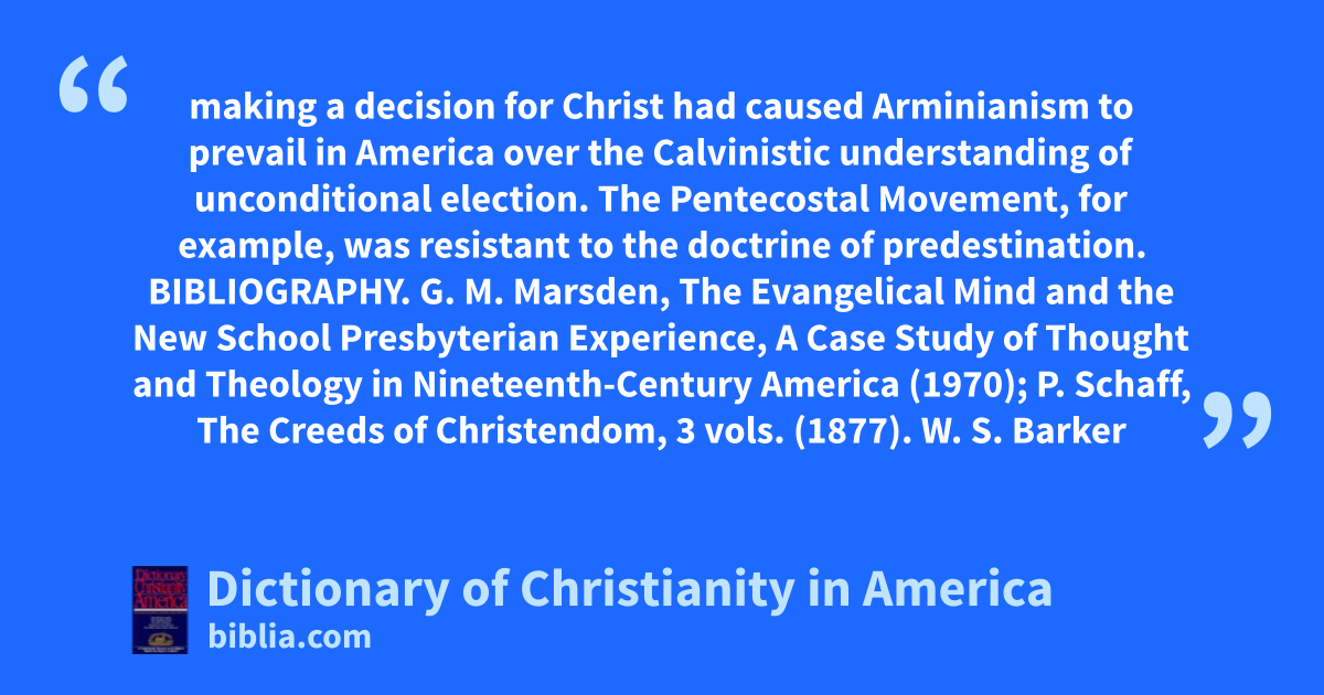 making a decision for Christ had caused Arminianism to prevail in America over the Calvinistic understanding of unconditional election. The Pentecostal Movement, for example, was resistant to the doctrine of predestination. BIBLIOGRAPHY. G. M. Marsden, The Evangelical Mind and the New School Presbyterian Experience, A Case Study of Thought and Theology in Nineteenth-Century America (1970); P. Schaff, The Creeds of Christendom, 3 vols. (1877). W. S. Barker