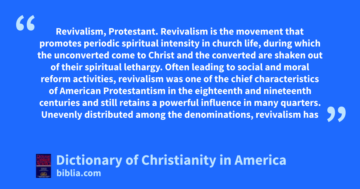 Revivalism, Protestant. Revivalism is the movement that promotes periodic spiritual intensity in church life, during which the unconverted come to Christ and the converted are shaken out of their spiritual lethargy. Often leading to social and moral reform activities, revivalism was one of the chief characteristics of American Protestantism in the eighteenth and nineteenth centuries and still retains a powerful influence in many quarters. Unevenly distributed among the denominations, revivalism has