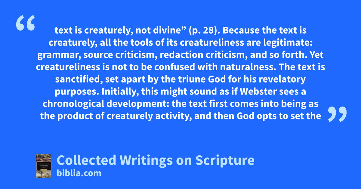 text is creaturely, not divine” (p. 28). Because the text is creaturely, all the tools of its creatureliness are legitimate: grammar, source criticism, redaction criticism, and so forth. Yet creatureliness is not to be confused with naturalness. The text is sanctified, set apart by the triune God for his revelatory purposes. Initially, this might sound as if Webster sees a chronological development: the text first comes into being as the product of creaturely activity, and then God opts to set the