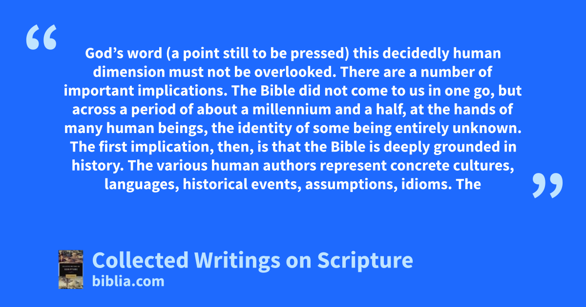 God’s word (a point still to be pressed) this decidedly human dimension must not be overlooked. There are a number of important implications. The Bible did not come to us in one go, but across a period of about a millennium and a half, at the hands of many human beings, the identity of some being entirely unknown. The first implication, then, is that the Bible is deeply grounded in history. The various human authors represent concrete cultures, languages, historical events, assumptions, idioms. The