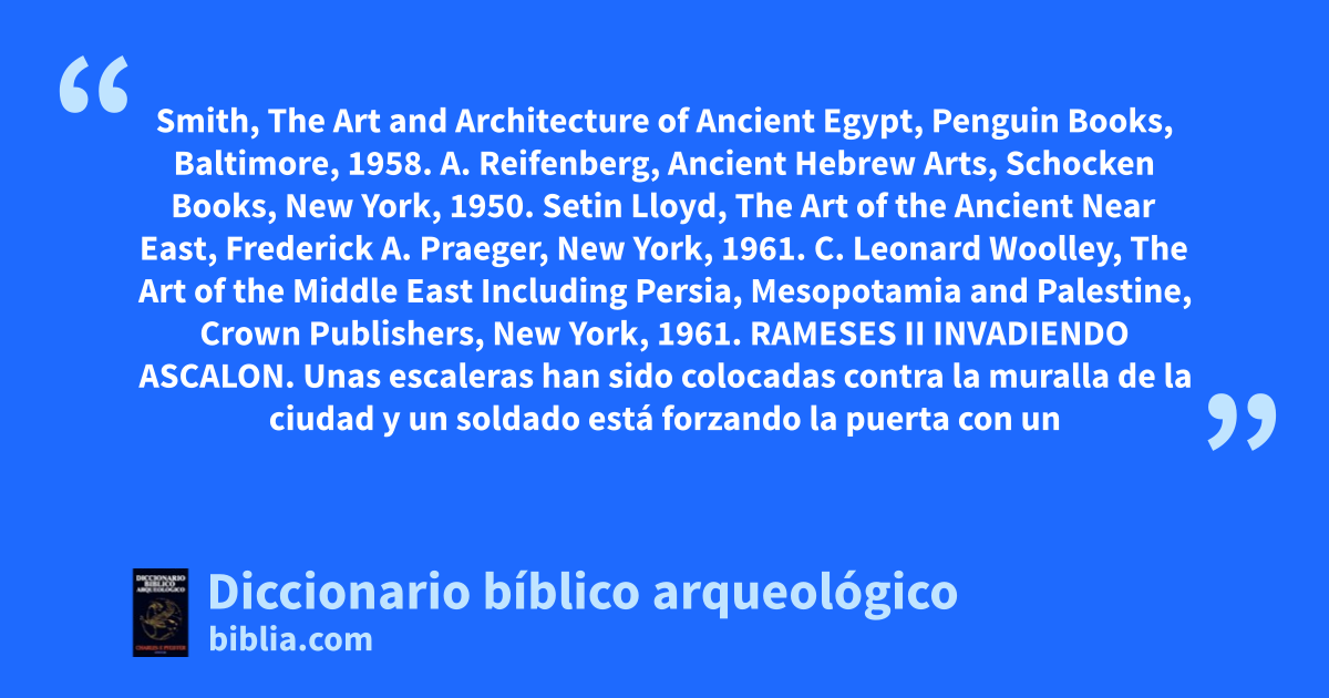Smith, The Art and Architecture of Ancient Egypt, Penguin Books, Baltimore, 1958. A. Reifenberg, Ancient Hebrew Arts, Schocken Books, New York, 1950. Setin Lloyd, The Art of the Ancient Near East, Frederick A. Praeger, New York, 1961. C. Leonard Woolley, The Art of the Middle East Including Persia, Mesopotamia and Palestine, Crown Publishers, New York, 1961. RAMESES II INVADIENDO ASCALON. Unas escaleras han sido colocadas contra la muralla de la ciudad y un soldado está forzando la puerta con un