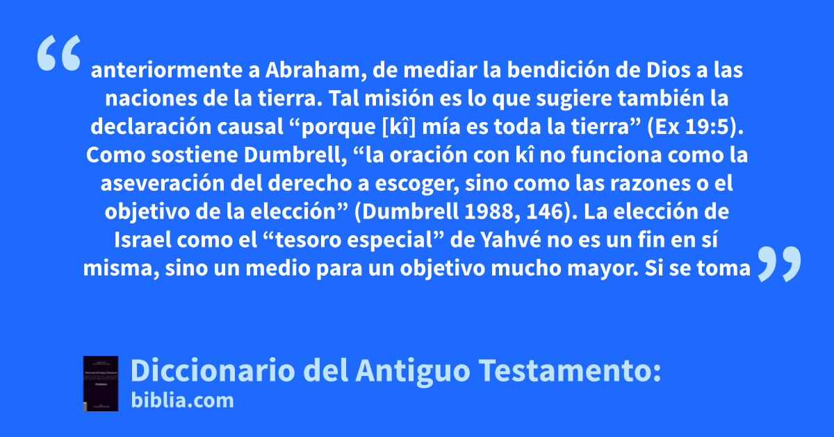 anteriormente a Abraham, de mediar la bendición de Dios a las naciones de la tierra. Tal misión es lo que sugiere también la declaración causal “porque [kî] mía es toda la tierra” (Ex 19:5). Como sostiene Dumbrell, “la oración con kî no funciona como la aseveración del derecho a escoger, sino como las razones o el objetivo de la elección” (Dumbrell 1988, 146). La elección de Israel como el “tesoro especial” de Yahvé no es un fin en sí misma, sino un medio para un objetivo mucho mayor. Si se toma
