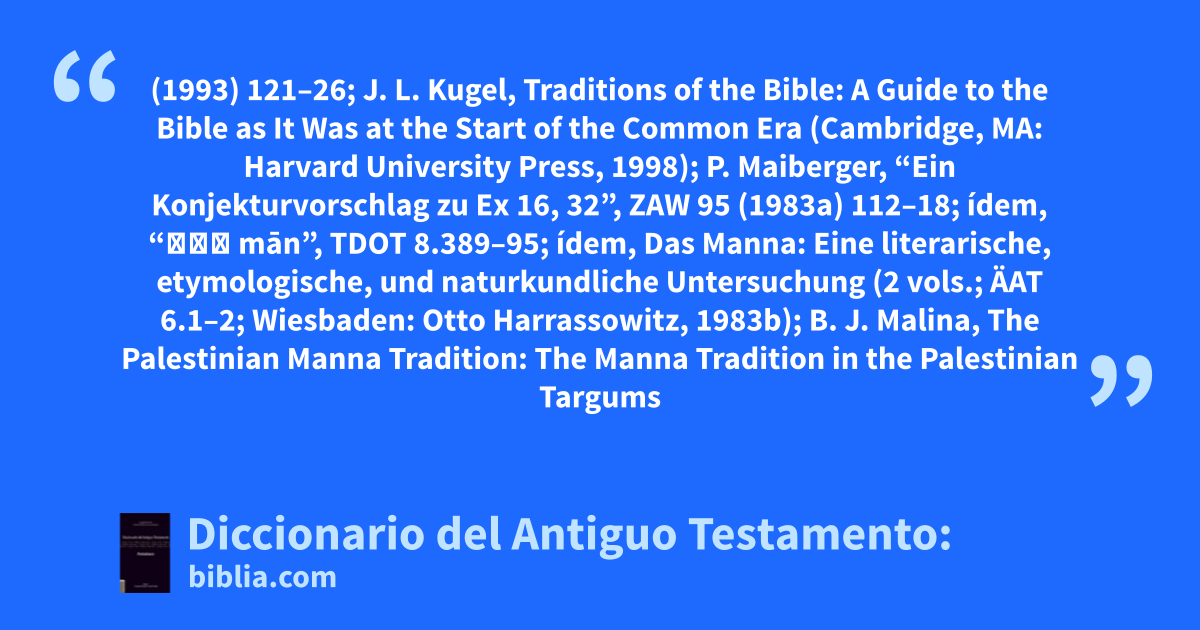 (1993) 121–26; J. L. Kugel, Traditions of the Bible: A Guide to the Bible as It Was at the Start of the Common Era (Cambridge, MA: Harvard University Press, 1998); P. Maiberger, “Ein Konjekturvorschlag zu Ex 16, 32”, ZAW 95 (1983a) 112–18; ídem, “מָן mān”, TDOT 8.389–95; ídem, Das Manna: Eine literarische, etymologische, und naturkundliche Untersuchung (2 vols.; ÄAT 6.1–2; Wiesbaden: Otto Harrassowitz, 1983b); B. J. Malina, The Palestinian Manna Tradition: The Manna Tradition in the Palestinian Targums