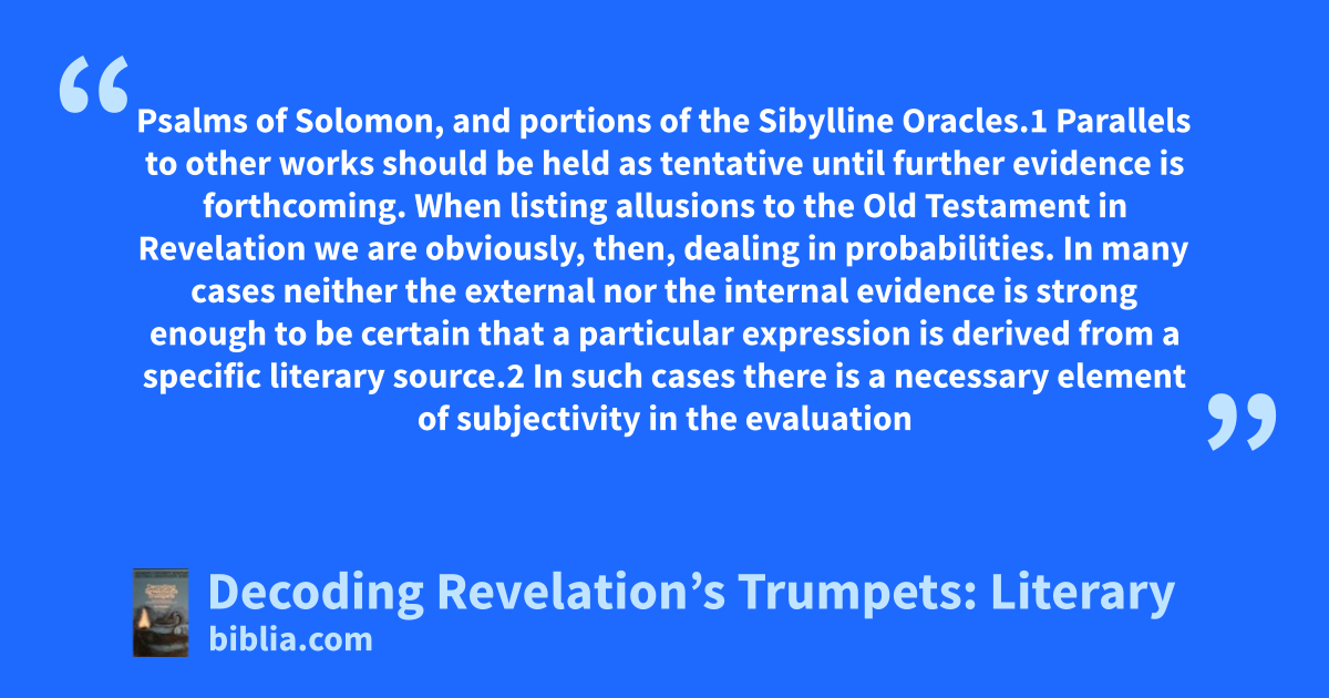Psalms of Solomon, and portions of the Sibylline Oracles.1 Parallels to other works should be held as tentative until further evidence is forthcoming. When listing allusions to the Old Testament in Revelation we are obviously, then, dealing in probabilities. In many cases neither the external nor the internal evidence is strong enough to be certain that a particular expression is derived from a specific literary source.2 In such cases there is a necessary element of subjectivity in the evaluation