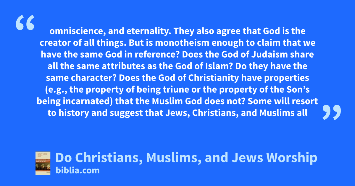 omniscience, and eternality. They also agree that God is the creator of all things. But is monotheism enough to claim that we have the same God in reference? Does the God of Judaism share all the same attributes as the God of Islam? Do they have the same character? Does the God of Christianity have properties (e.g., the property of being triune or the property of the Son’s being incarnated) that the Muslim God does not? Some will resort to history and suggest that Jews, Christians, and Muslims all