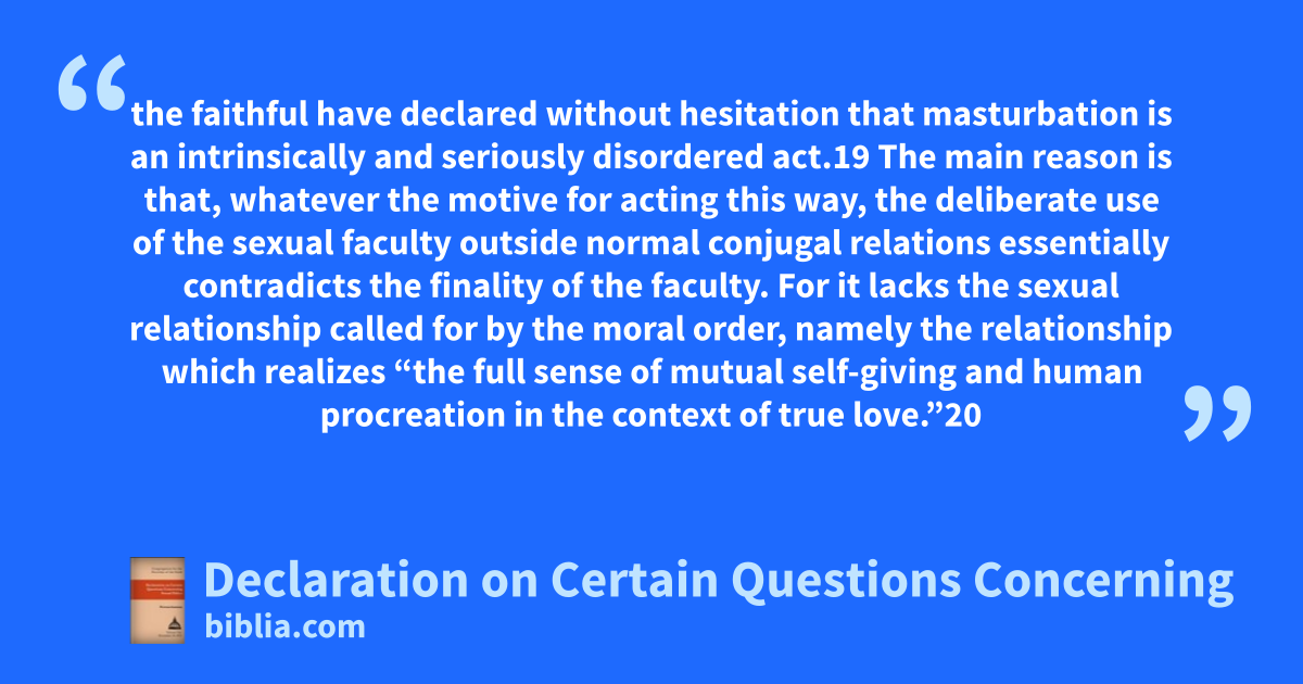 the faithful have declared without hesitation that masturbation is an intrinsically and seriously disordered act.19 The main reason is that, whatever the motive for acting this way, the deliberate use of the sexual faculty outside normal conjugal relations essentially contradicts the finality of the faculty. For it lacks the sexual relationship called for by the moral order, namely the relationship which realizes “the full sense of mutual self-giving and human procreation in the context of true love.”20