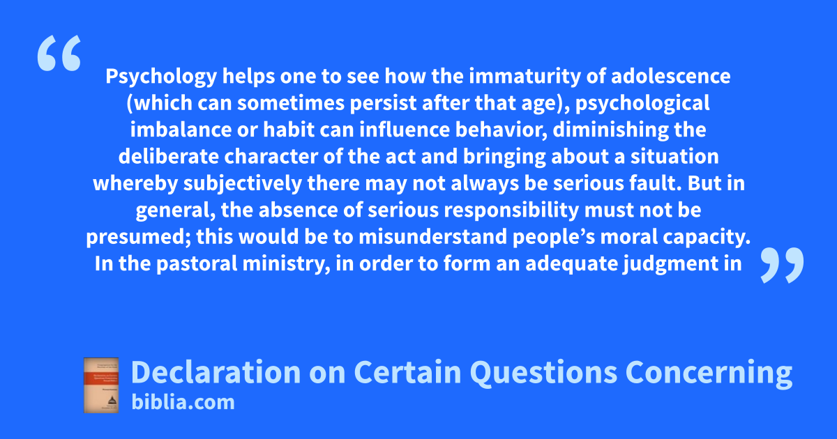 Psychology helps one to see how the immaturity of adolescence (which can sometimes persist after that age), psychological imbalance or habit can influence behavior, diminishing the deliberate character of the act and bringing about a situation whereby subjectively there may not always be serious fault. But in general, the absence of serious responsibility must not be presumed; this would be to misunderstand people’s moral capacity. In the pastoral ministry, in order to form an adequate judgment in