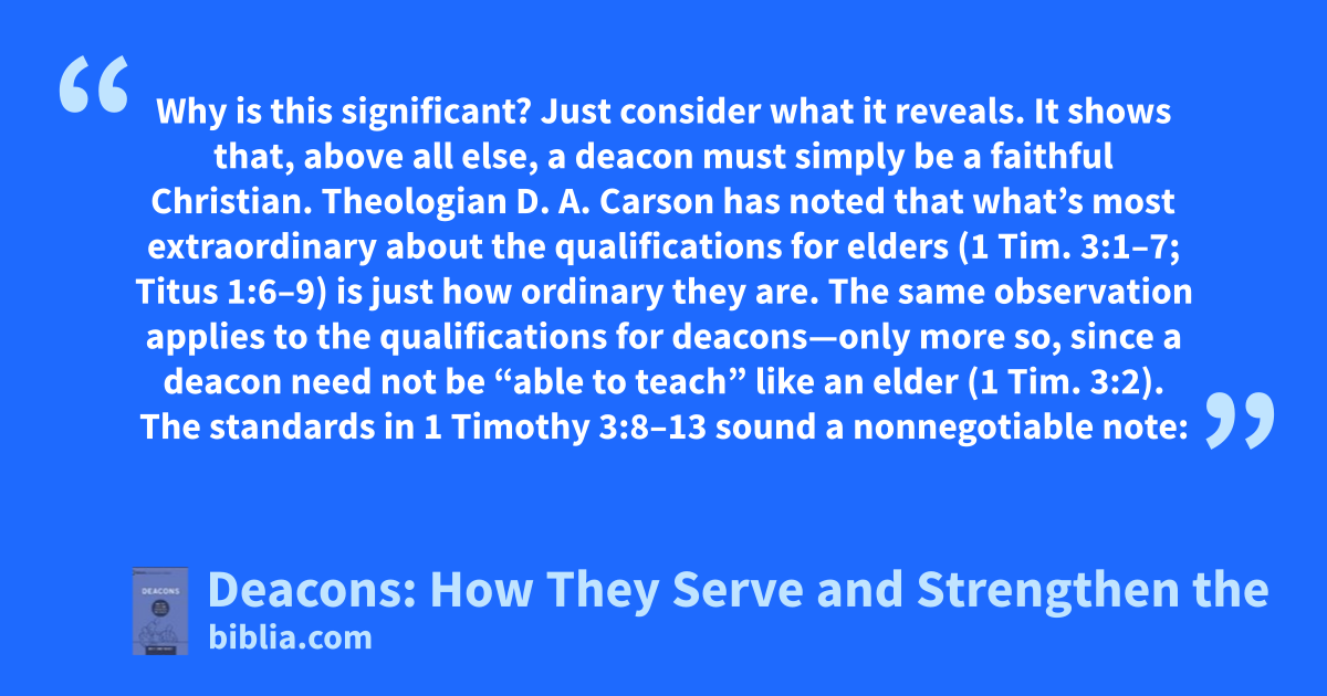 Why is this significant? Just consider what it reveals. It shows that, above all else, a deacon must simply be a faithful Christian. Theologian D. A. Carson has noted that what’s most extraordinary about the qualifications for elders (1 Tim. 3:1–7; Titus 1:6–9) is just how ordinary they are. The same observation applies to the qualifications for deacons—only more so, since a deacon need not be “able to teach” like an elder (1 Tim. 3:2). The standards in 1 Timothy 3:8–13 sound a nonnegotiable note: