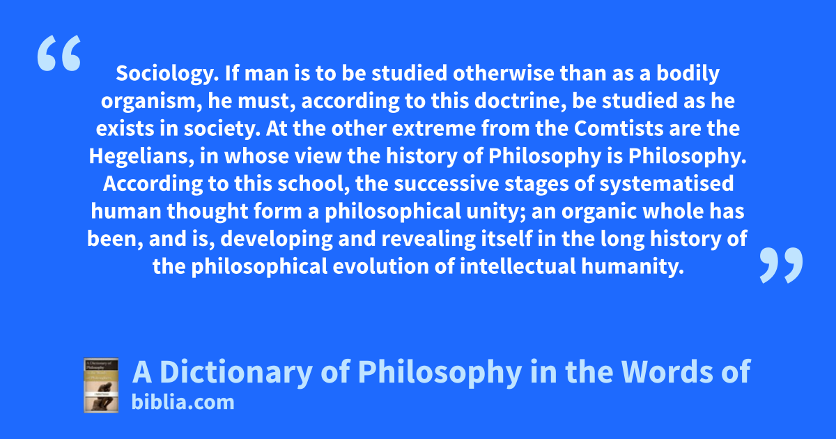 Sociology. If man is to be studied otherwise than as a bodily organism, he must, according to this doctrine, be studied as he exists in society. At the other extreme from the Comtists are the Hegelians, in whose view the history of Philosophy is Philosophy. According to this school, the successive stages of systematised human thought form a philosophical unity; an organic whole has been, and is, developing and revealing itself in the long history of the philosophical evolution of intellectual humanity.