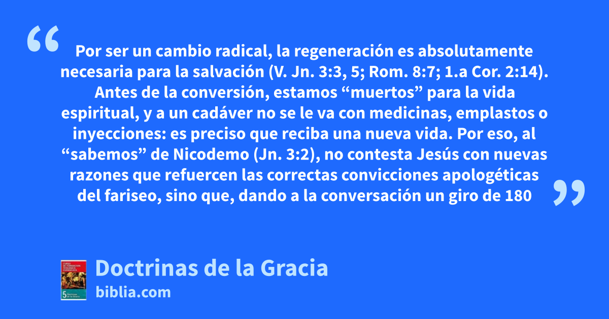 Por ser un cambio radical, la regeneración es absolutamente necesaria para la salvación (V. Jn. 3:3, 5; Rom. 8:7; 1.a Cor. 2:14). Antes de la conversión, estamos “muertos” para la vida espiritual, y a un cadáver no se le va con medicinas, emplastos o inyecciones: es preciso que reciba una nueva vida. Por eso, al “sabemos” de Nicodemo (Jn. 3:2), no contesta Jesús con nuevas razones que refuercen las correctas convicciones apologéticas del fariseo, sino que, dando a la conversación un giro de 180