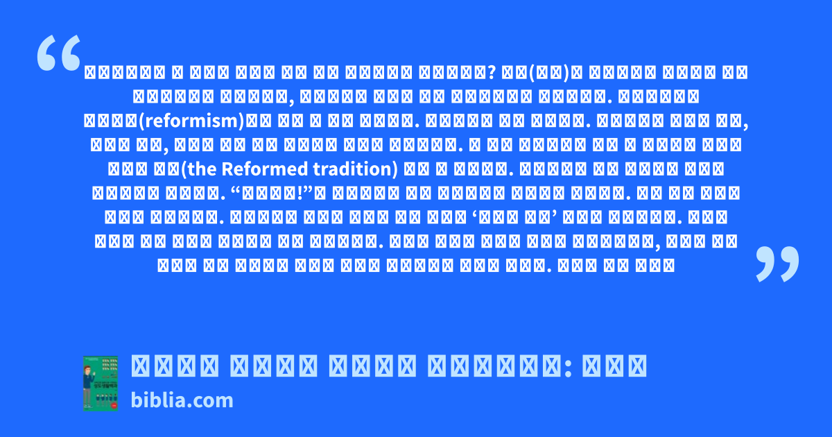 개혁주의라는 말 자체가 어감상 그리 좋게 들리지만은 않잖습니까? 주의(主義)란 공산주의나 자본주의 같은 이데올로기를 암시하는데, 개혁주의는 개혁을 위한 이데올로기는 아니니까요. 영어권에서도 개혁주의(reformism)라는 말은 잘 쓰지 않습니다. 신학에서는 더욱 그렇고요. 개혁주의는 개혁된 교회, 개혁된 신앙, 개혁된 신학 등을 아우르는 총체적 개념입니다. 이 같은 개혁주의를 가장 잘 드러내는 표현이 개혁된 전통(the Reformed tradition) 정도 될 것입니다. 개혁주의는 어떤 운동이나 구호를 의미하지도 않습니다. “개혁하자!”고 주장한다고 해서 개혁주의가 아니라는 말입니다. 내용 없는 구호는 선동에 불과합니다. 개혁주의가 말하는 개혁은 아주 당연히 ‘성경에 따른’ 개혁을 의미합니다. 여기서 중요한 것은 성경을 따른다는 것의 의미입니다. 모두가 그것을 동일한 의미로 받아들였다면, 오늘날 한국 개신교 안에 교회들이 수많은 형태로 존재하지는 않았을 테지요. 성경에 따른 개혁이
