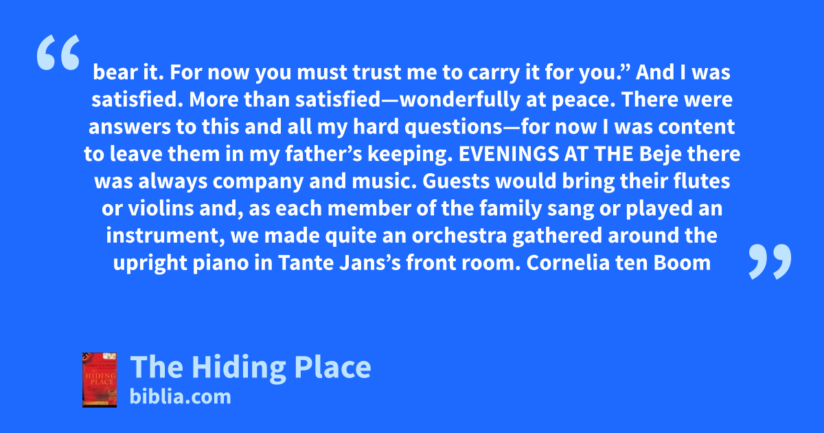 bear it. For now you must trust me to carry it for you.” And I was satisfied. More than satisfied—wonderfully at peace. There were answers to this and all my hard questions—for now I was content to leave them in my father’s keeping. EVENINGS AT THE Beje there was always company and music. Guests would bring their flutes or violins and, as each member of the family sang or played an instrument, we made quite an orchestra gathered around the upright piano in Tante Jans’s front room. Cornelia ten Boom