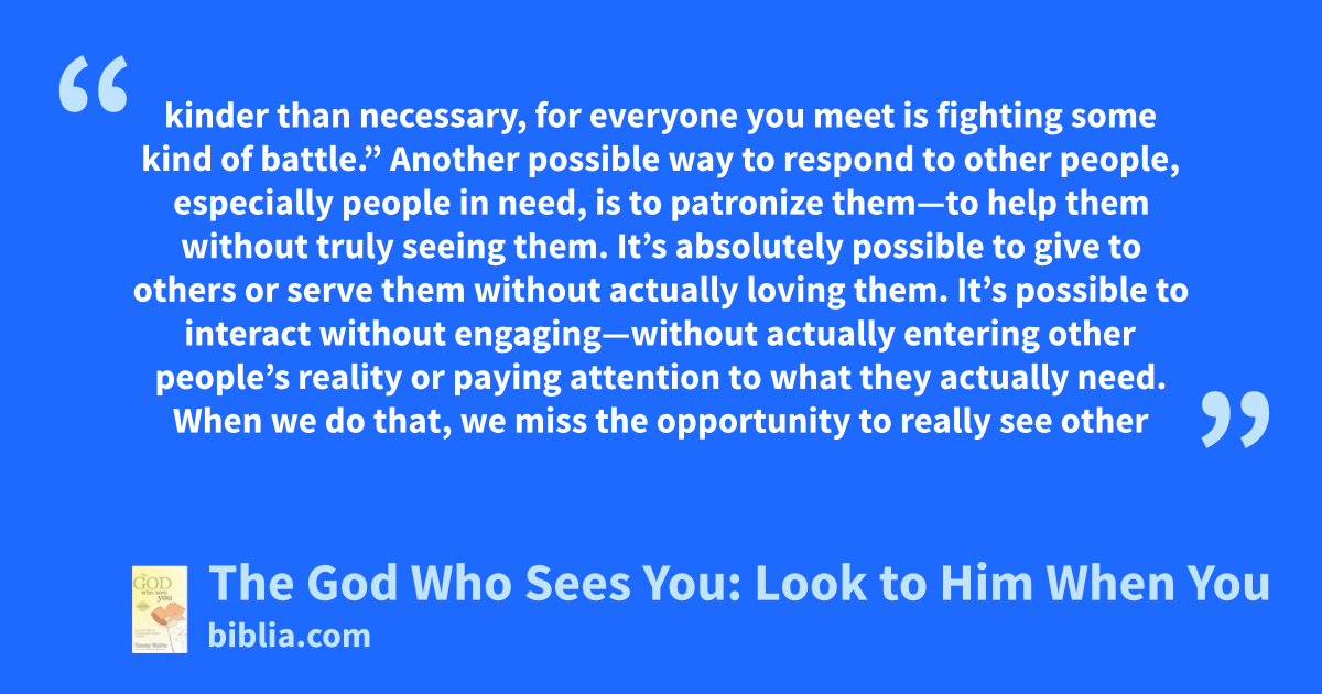 kinder than necessary, for everyone you meet is fighting some kind of battle.” Another possible way to respond to other people, especially people in need, is to patronize them—to help them without truly seeing them. It’s absolutely possible to give to others or serve them without actually loving them. It’s possible to interact without engaging—without actually entering other people’s reality or paying attention to what they actually need. When we do that, we miss the opportunity to really see other