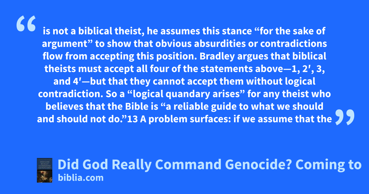 is not a biblical theist, he assumes this stance “for the sake of argument” to show that obvious absurdities or contradictions flow from accepting this position. Bradley argues that biblical theists must accept all four of the statements above—1, 2ʹ, 3, and 4ʹ—but that they cannot accept them without logical contradiction. So a “logical quandary arises” for any theist who believes that the Bible is “a reliable guide to what we should and should not do.”13 A problem surfaces: if we assume that the