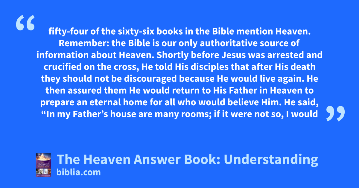 fifty-four of the sixty-six books in the Bible mention Heaven. Remember: the Bible is our only authoritative source of information about Heaven. Shortly before Jesus was arrested and crucified on the cross, He told His disciples that after His death they should not be discouraged because He would live again. He then assured them He would return to His Father in Heaven to prepare an eternal home for all who would believe Him. He said, “In my Father’s house are many rooms; if it were not so, I would