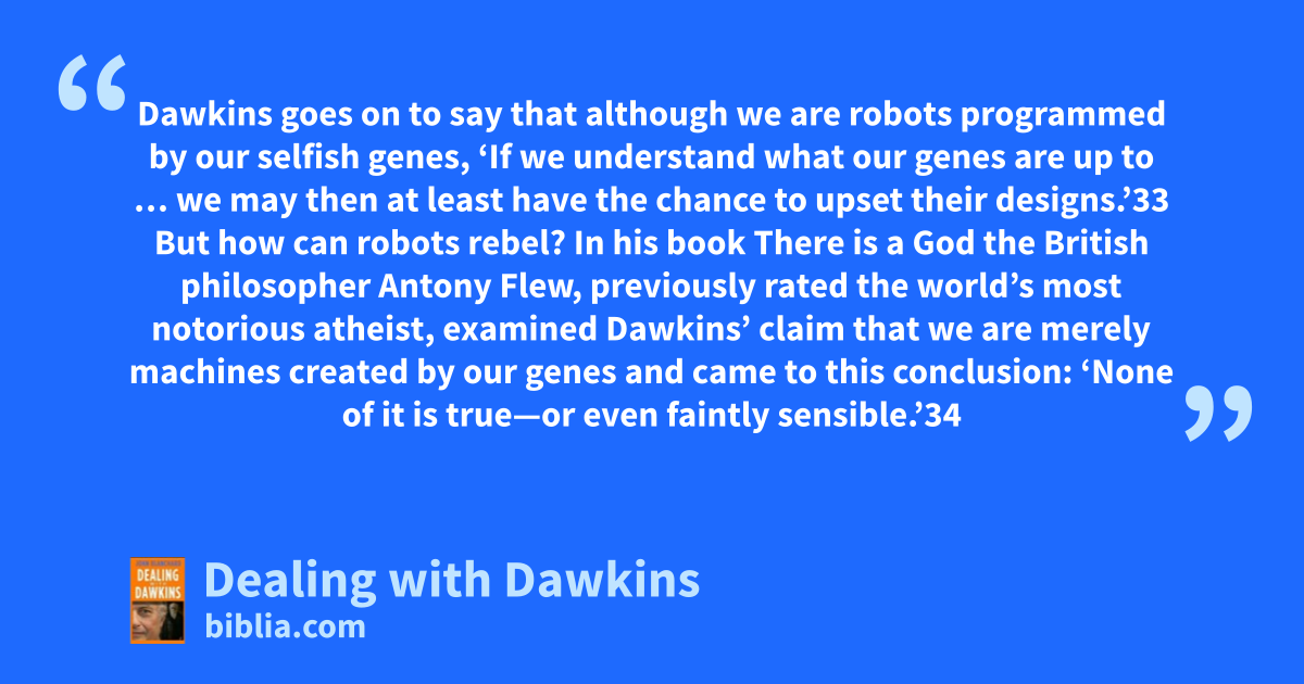 Dawkins goes on to say that although we are robots programmed by our selfish genes, ‘If we understand what our genes are up to … we may then at least have the chance to upset their designs.’33 But how can robots rebel? In his book There is a God the British philosopher Antony Flew, previously rated the world’s most notorious atheist, examined Dawkins’ claim that we are merely machines created by our genes and came to this conclusion: ‘None of it is true—or even faintly sensible.’34
