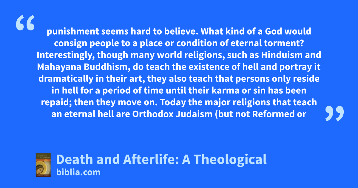 punishment seems hard to believe. What kind of a God would consign people to a place or condition of eternal torment? Interestingly, though many world religions, such as Hinduism and Mahayana Buddhism, do teach the existence of hell and portray it dramatically in their art, they also teach that persons only reside in hell for a period of time until their karma or sin has been repaid; then they move on. Today the major religions that teach an eternal hell are Orthodox Judaism (but not Reformed or