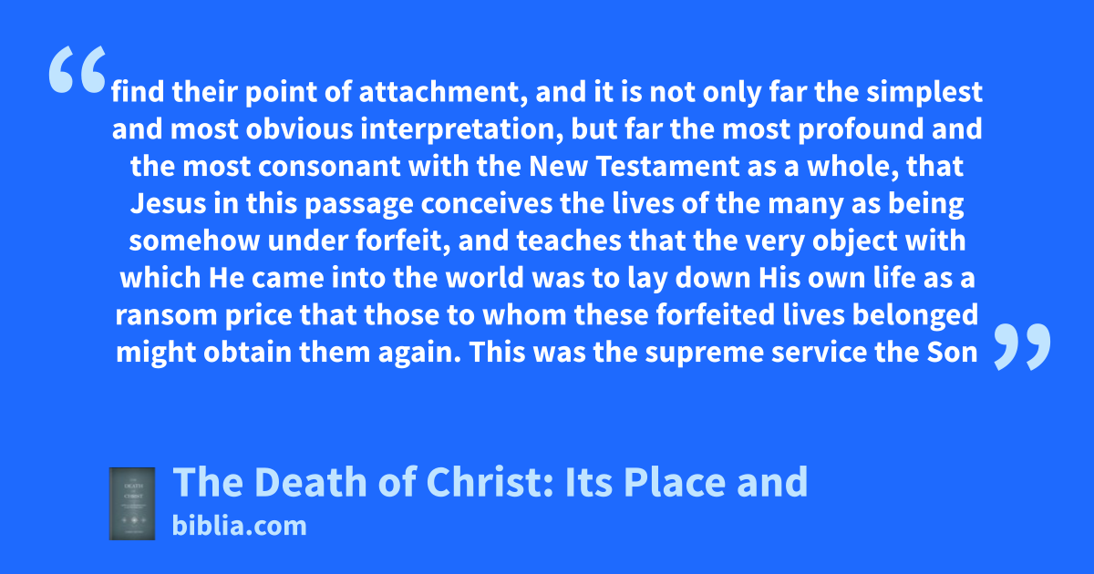 find their point of attachment, and it is not only far the simplest and most obvious interpretation, but far the most profound and the most consonant with the New Testament as a whole, that Jesus in this passage conceives the lives of the many as being somehow under forfeit, and teaches that the very object with which He came into the world was to lay down His own life as a ransom price that those to whom these forfeited lives belonged might obtain them again. This was the supreme service the Son