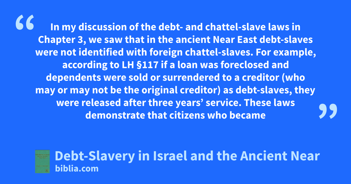 In my discussion of the debt- and chattel-slave laws in Chapter 3, we saw that in the ancient Near East debt-slaves were not identified with foreign chattel-slaves. For example, according to LH §117 if a loan was foreclosed and dependents were sold or surrendered to a creditor (who may or may not be the original creditor) as debt-slaves, they were released after three years’ service. These laws demonstrate that citizens who became