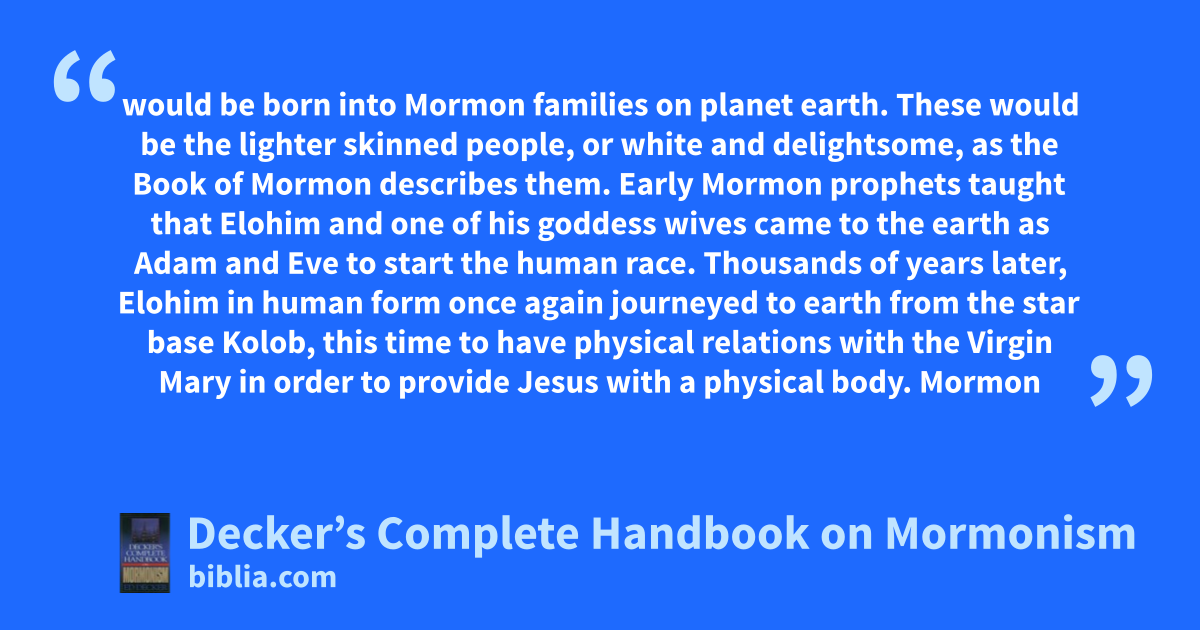 would be born into Mormon families on planet earth. These would be the lighter skinned people, or white and delightsome, as the Book of Mormon describes them. Early Mormon prophets taught that Elohim and one of his goddess wives came to the earth as Adam and Eve to start the human race. Thousands of years later, Elohim in human form once again journeyed to earth from the star base Kolob, this time to have physical relations with the Virgin Mary in order to provide Jesus with a physical body. Mormon