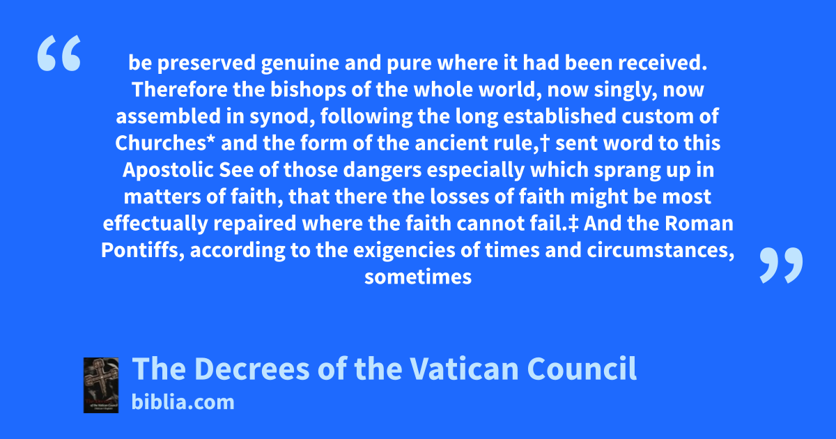 be preserved genuine and pure where it had been received. Therefore the bishops of the whole world, now singly, now assembled in synod, following the long established custom of Churches* and the form of the ancient rule,† sent word to this Apostolic See of those dangers especially which sprang up in matters of faith, that there the losses of faith might be most effectually repaired where the faith cannot fail.‡ And the Roman Pontiffs, according to the exigencies of times and circumstances, sometimes